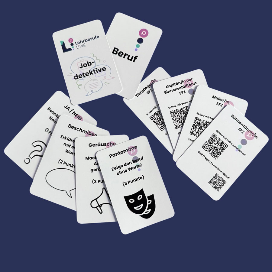 Das Kartenspiel «Jobdetektive» bietet eine kreative Möglichkeit, das Thema Berufsorientierung im Unterricht auf spielerische Weise zu gestalten. Schülerinnen und Schüler erraten Berufe anhand kurzer Hinweise und entdecken über QR- Codes auf jedem Kärtchen spannende Videoporträts auf lehrberufe-live.ch – direkt erzählt von Lernenden.